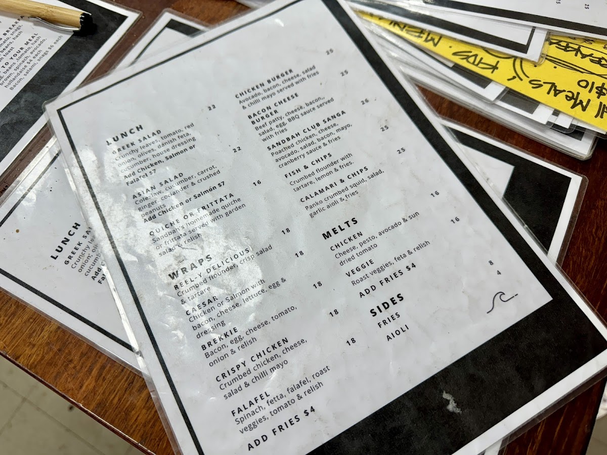 - Wraps: Various fillings are available including Fish, Caesar, Brekkie, Crispy Chicken, and Falafel, catering to different tastes.